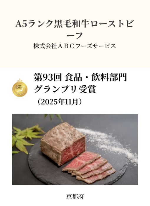 肉のABCフーズサービスのA5黒毛和牛ローストビーフが日本で最も厳しい食品の品評会『JAPAN FOOD SELECTION』で最優秀賞グランプリを受賞しました!