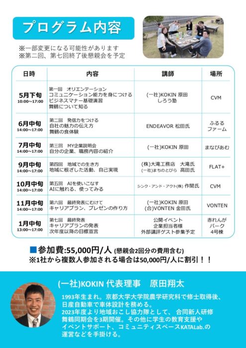 舞鶴で働く新入社員・若手社員が集まって、同じメンバーで一緒に一年間研修するプログラムです!