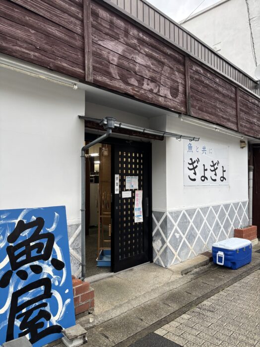 今回ご紹介するぎょぎょさんの青い看板が掲げられています。