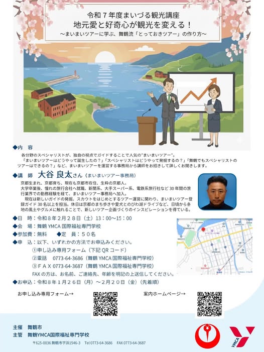 舞鶴市では市民や市内業者の方々に、舞鶴の魅力を再発見してもらうことを目的に「まいづる観光講座」を開催します。(会場:舞鶴YMCA国際福祉専門学校)