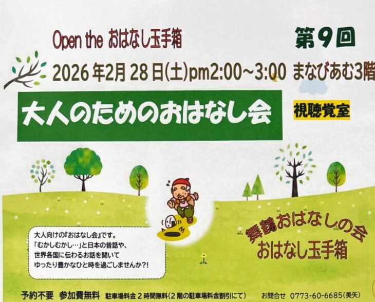 大人向けの『おはなし会』です。 「むかしむかし…」と日本の昔話や、世界各国に伝わるお話を聞いてゆったり豊かなひと時を過ごしませんか?!