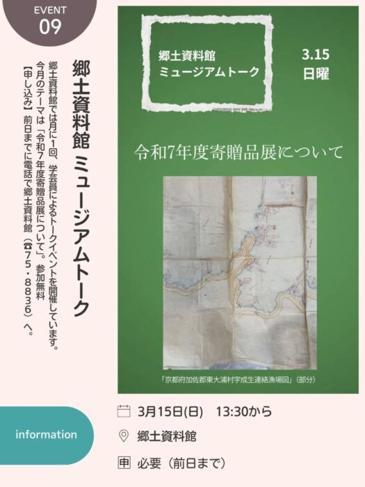 郷土資料館では月に1回、学芸員によるトークイベントを開催しています。 今月のテーマは「令和7年度寄贈品展について」。参加無料