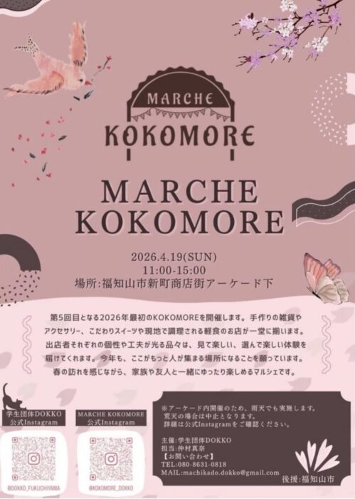 第5回目となる2026年最初のKOKOMOREを開催します。手作りの雑貨やアクセサリー、こだわりのスイーツや現地で調理される軽食のお店が一堂に揃います。出展者それぞれの個性や工夫が光る品々は、見て楽しい、選んで楽しい体験を届けてくれます。今年も、ここがもっと人が集まる場所になることを願っています。