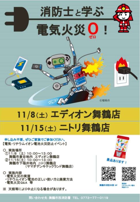 ◆内容電気コードや暖房器具、リチウムイオン電池から発生する火災の予防方法や捨て方などの説明詳しくは、ホームページで確認を。https://www.maizuru119.com/sbs_n_42.html