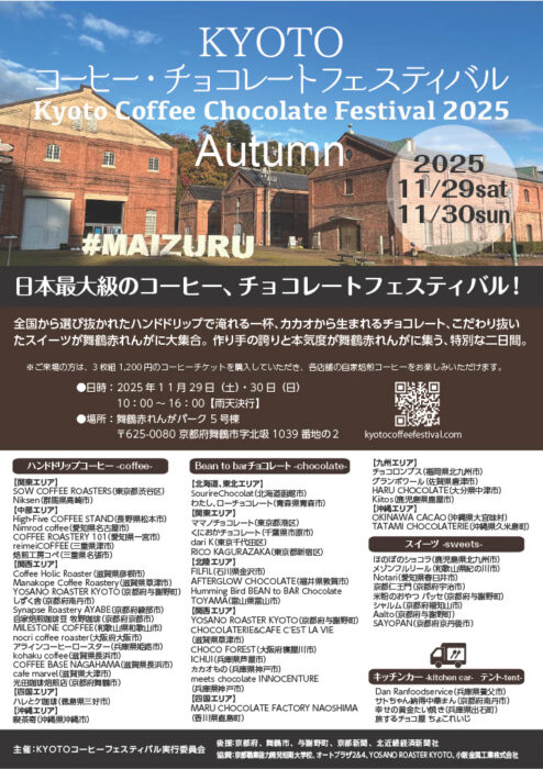 全国から選び抜かれたハンドグリップで淹れる一杯、カカオから生まれるチョコレート、こだわり抜いたスイーツが舞鶴赤れんがに大集合。作り手の誇りと本気度が舞鶴赤れんがに集う、特別な二日間。