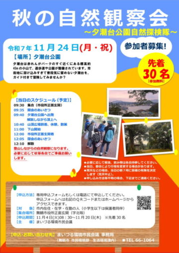 まいづる環境市民会議の主催による自然観察会を夕潮台で開催します。 自然観察ガイドブック「舞鶴フィー…